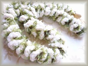 | ベーシックなクロシェ編みで作ります。Splash Yarnと、ライオンブランドのChenille Sensations Yarnとサテンリボンで、とても上品なボリュームが出ているシックで素敵なレイです。 | |||||||||||||||||||||||||||||||||||||||||||||||||||||||||||||||||||||||||||||||||||||||||||||