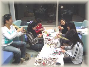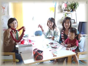 2005年11月8日(AM)は、先日もお邪魔させていただいたMamikoさん達3名様の出張リボンレイクラスでした。今回はクリスマスが近かったので、皆様クリスマスカラーのレイをお作りになられていらっしゃいました。皆様フラダンスをされていらっしゃるということで、ご自分で作られたレイをして踊る楽しみがあって羨ましかったです(私は運動オンチ?!なので・・・^^;) 無事に作り方をマスターされて、完成が楽しみですね。また皆様にリクエストしていただけるのを楽しみにしていますね〜♪ |