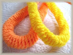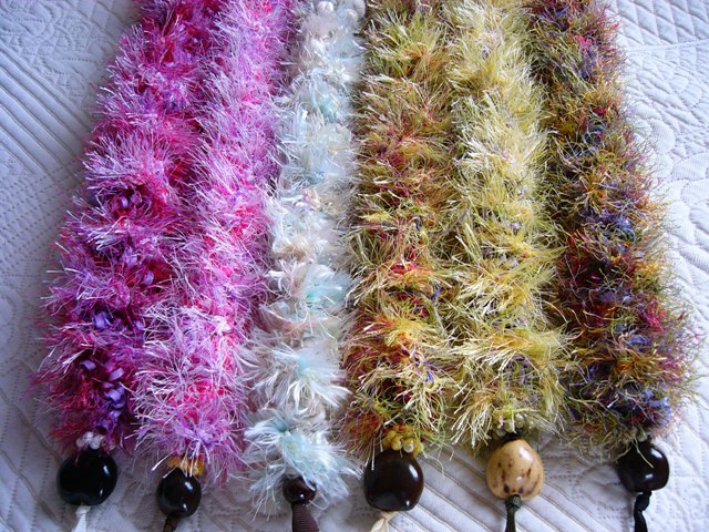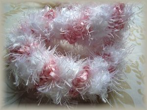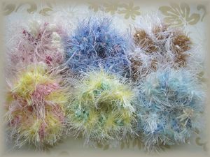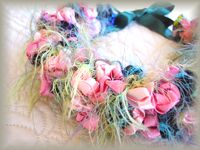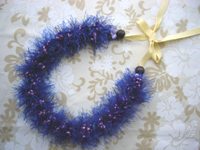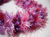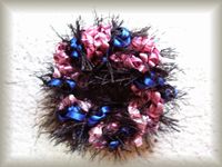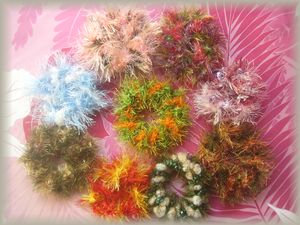 | 3色のサテンリボンとフェザーアイラッシュヤーン3種をミックスして作ったシュシュです。とてもさわやかでやさしい表情に仕上がりました。 | ブラックのアイラッシュヤーンに、ピンク・紫・ブルーのサテンリボンをローズ風に編んで仕上げたシュシュも素敵でしょ?その日のファッションに合わせてアレンジして使っています。 | ||||