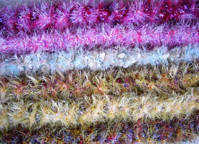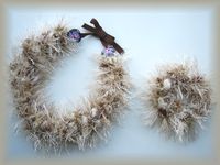 輸入ピコリボンとFunny Yarnの組み合わせが軽やかで素敵な「ミニレフアレイ」です。 先にピコリボンの部分を縫ってから毛糸を絡ませて仕上げます。 |