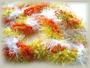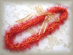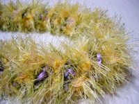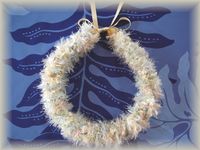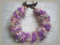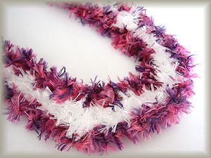 | ベーシックなクロシェ編みで作ります。Splash Yarnと、ライオンブランドのChenille Sensations Yarnとサテンリボンで、とても上品なボリュームが出ているシックで素敵なレイです。 | |||||||||||||||||||||||||||||||||||||||||||||||||||||||||||||||||||||||||||||||||||||||||||||