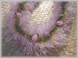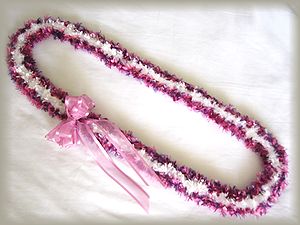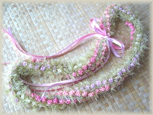 | Funny yarn2本とサテンリボン2本で編んだ Ku'u Ipo(Sweetheart)です。とってもラブリーでかわいいレイに仕上がりました。私のムームーとお揃いでとっても気に入っているクロッシェのひとつです。 | |||||||||||||||||||||||||||||||||||||||||||||||||||||||||||||||||||||||||||||||||||||||||||||