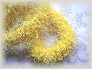 | 2本のFunny yarnと2本のFizz yarnにサテンリボンをポイントとして編んだ Mellow Yellow です。ソフトなイエローカラーがとってもオシャレでキュートでしょ? | |||||||||||||||||||||||||||||||||||||||||||||||||||||||||||||||||||||||||||||||||||||||||||||