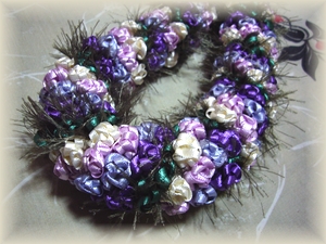 | 2本のFunny yarnと1本のFizz yarnに2色のサテンリボンと1本のシフォンリボンを編みこんだIkaika Strongです。シックでオシャレですがカラフルなお花がポイントになってとってもかわいいレイです。 | |||||||||||||||||||||||||||||||||||||||||||||||||||||||||||||||||||||||||||||||||||||||||||||