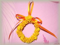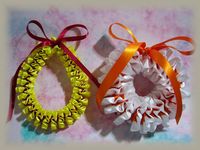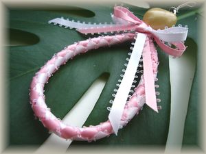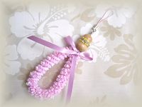 | と〜ってもキュートなミニレイ達で〜す。写真右側がレフアペパで、 左側はダブルプルメリアです。リボンで作った巻きバラをモチーフにして付けてあげたら、ほ〜んとにかわいらしいレイに仕上がりました〜♪ お部屋のワンポイントにぜひ作ってみてくださいね。 | |||||||