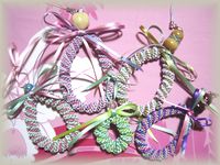 | 2色の山道テープ(リックラックテープ)で作ったリックラックシャワー トゥリーストラップです。少々きつめに通し綺麗ならせん状になる様に仕上げていきます。レッド&ホワイトとピンク&ホワイトです。どちらも飾りサテンリボンを同色にしてかわいさ倍増にしました〜♪ | |||||||
