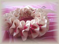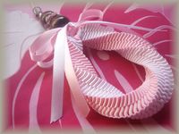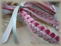 | ピンクとホワイトのツイストがとてもキュートな「ツイステッドスクエアノットレイ」です。6mmリボンを4本、5mずつ使っています。とてもかわいく出来上がりました。通常のスクエアノットと少し編み方が違うところが楽しいですね。 | |||||||