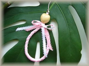 とってもかわいいピコリボンで編んだ「ダイアモンドウィーブレイストラップ」です。とっても簡単でスピーディーに仕上がってしまいますので、お色違いでたくさん作ってみたくなるレイです。プレゼントとしては最適ですね♪ |