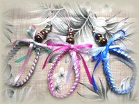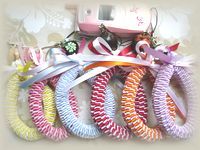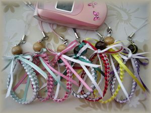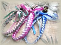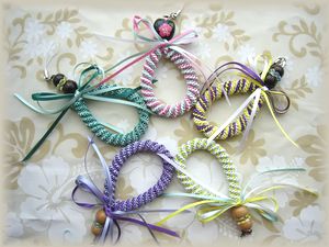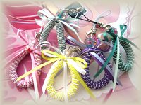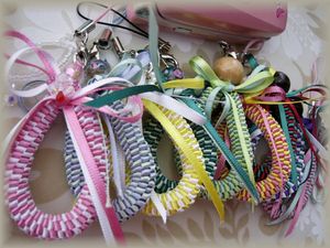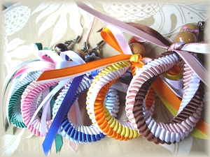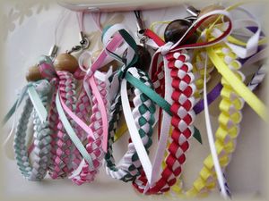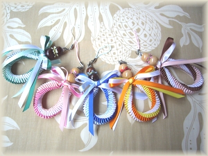 | 3本の3mmサテンリボンを編んでいく「Circle Weave」(サークルウィーブ)です。スタート部分からかなり複雑で難しいですが、なれるととても楽しく編めちゃいます。新色も加わってたくさんのストラップができました。こちらはお教室に通ってくださっている生徒さんにも大人気で、みなさん悪戦苦闘していらっしゃいましたが、マスターできるととても喜んでましたね♪プレゼントとしても最適ですよ〜♪ | |||||||