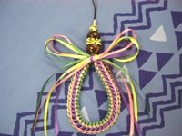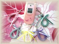 | 3mmサテンリボンで作ったミニスクエアノットストラップです。6mmサイズよりもより携帯ストラップとしては最適でかわいく仕上がりました。アップの画像を見ていただくと分かると思いますが、スワロフスキービーズでより豪華でかわいく作ってみました。30分くらいで出来上がってしまいますので是非みなさんに作っていただきたいストラップですね。お色の配色はお好みで〜♪ --> 拡大画像 | |||||||
