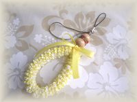 | 9mm幅の黄色サテンリボンで作った3Dブレード(パイナップル)ストラップです。ティーリーフと絡ませて、ボリューム&インパクトのある素敵なレイに仕上がりました。バックにぶら下げて、気分はいつもハワイア〜ン気分デス*^0^* | |||||||