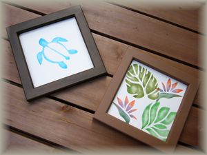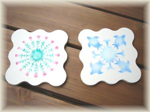 | こちらの2枚は、タイル素材でペイント前にアルコールで下地を塗ってからのステンシルでした。乾くまでに誇りやごみが付かないように注意する必要がありました。どちらもとても満足のいく仕上がりで〜す♪ | ウッド素材のコースター2枚です。左はロケラニで右がホヌのキルト柄です。初心者向けの簡単な手法でスピーディーに仕上がりました。 | ||