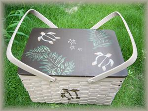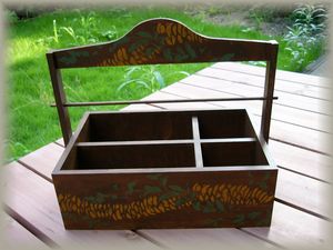 | 4枚のプレートにそれぞれ4種のキルト柄をステンシルしました。額が暗めの色なので、カラフルな明るめの色を選択してみました。リボンレイと一緒に玄関に飾っています♪ | イリマとマイレの素敵なソーイングボックスです。真ん中の棒に糸を通しておくととても便利です。リボンレイ作りに必要な手芸材料が、このボックス1つに収まるのでとても便利です。デザイン&形作りから製作しました。 | ||