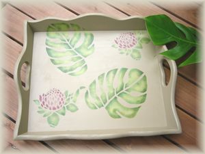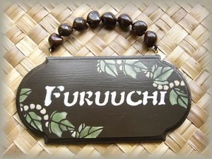 | 見ての通り、私達の家の表札です。ククイのボーダーラインに合わせて、ハワイの天然ククイナッツを取り付けました。名前の部分は自分で形作りから製作したので少し難しかったです。 | モンステラとトーチジンジャーのトレーです。ちょっと大きめなのでお教室に来てくださる生徒さんにお出ししているコーヒーやお菓子などを乗せるのにぴったりです。もちろん毎日活躍しています〜^0^ | ||