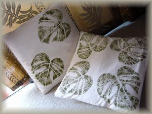 | ステンシル講師のかおり先生に始めてお会いした時に製作したCDボックスです。ピカケ&マイレのとってもラブリーな仕上がりにすっかりステンシルの世界にはまってしまいました。塗り塗りペイントするのは昔のネイル時代を思い出されてとても楽しいです〜♪ | 布にステンシル?!なんと大胆にも海綿にペイントを付けてポンポンしていくだけなのです〜。ムラ染め風に仕上がるように力加減は慎重に調節していきます。もうすでに毎日私のお尻の下にいます^^; | ||
