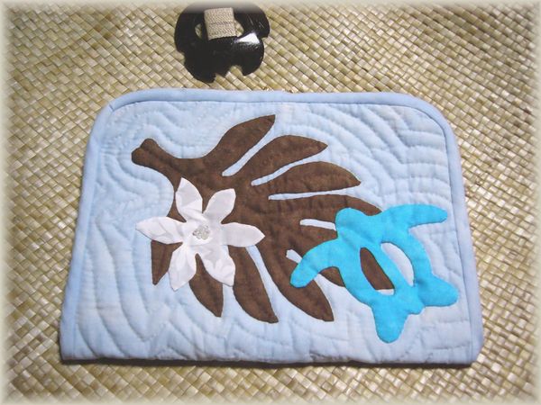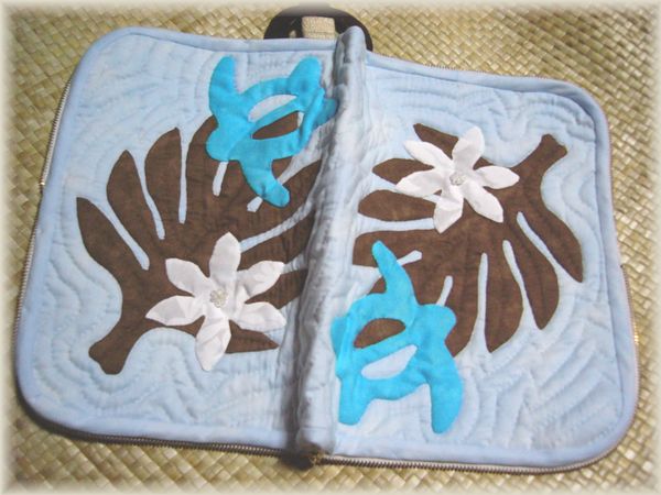 2005年9月完成  町田クラスに通ってくださっているKeiko先生デザインのセカンドバック(ソーイングバック)です。モンステラとホヌとティアレのとってもかわいいモチーフが気に入っています。配色違いでお母さんも作りました。サイズ40×28
