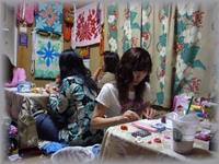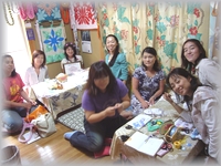 6月28日の町田クラスは、久しぶりにQちゃん登場!7月7日の七夕から横浜の元町のハワイアンロミロミサロンでリボンレイクラスを開催します。 サロンのリンクは「イントラ卒業生ページのQちゃんコーナー」に掲載してありますので、お近くの方は是非遊びに行きましょう〜。 午後クラスはまったりと皆様リボンレイ作りを楽しまれていましたね。 次回でご卒業の「Satoko」さんは、ラストスパートでがんばっていらっしゃいました。 |