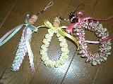 イポラニハワイのインストラクターコースでがんばって下さっているMayumiさんのレイたちです。とてもお上手に仕上がりましたね。ロングレイも ストラップもた〜くさんがんばってらっしゃいますよね!来年からの講師デビューに向けてもっとも〜っとたくさんのレイに挑戦しましょう〜。また 作品の紹介させてくださいね。 |