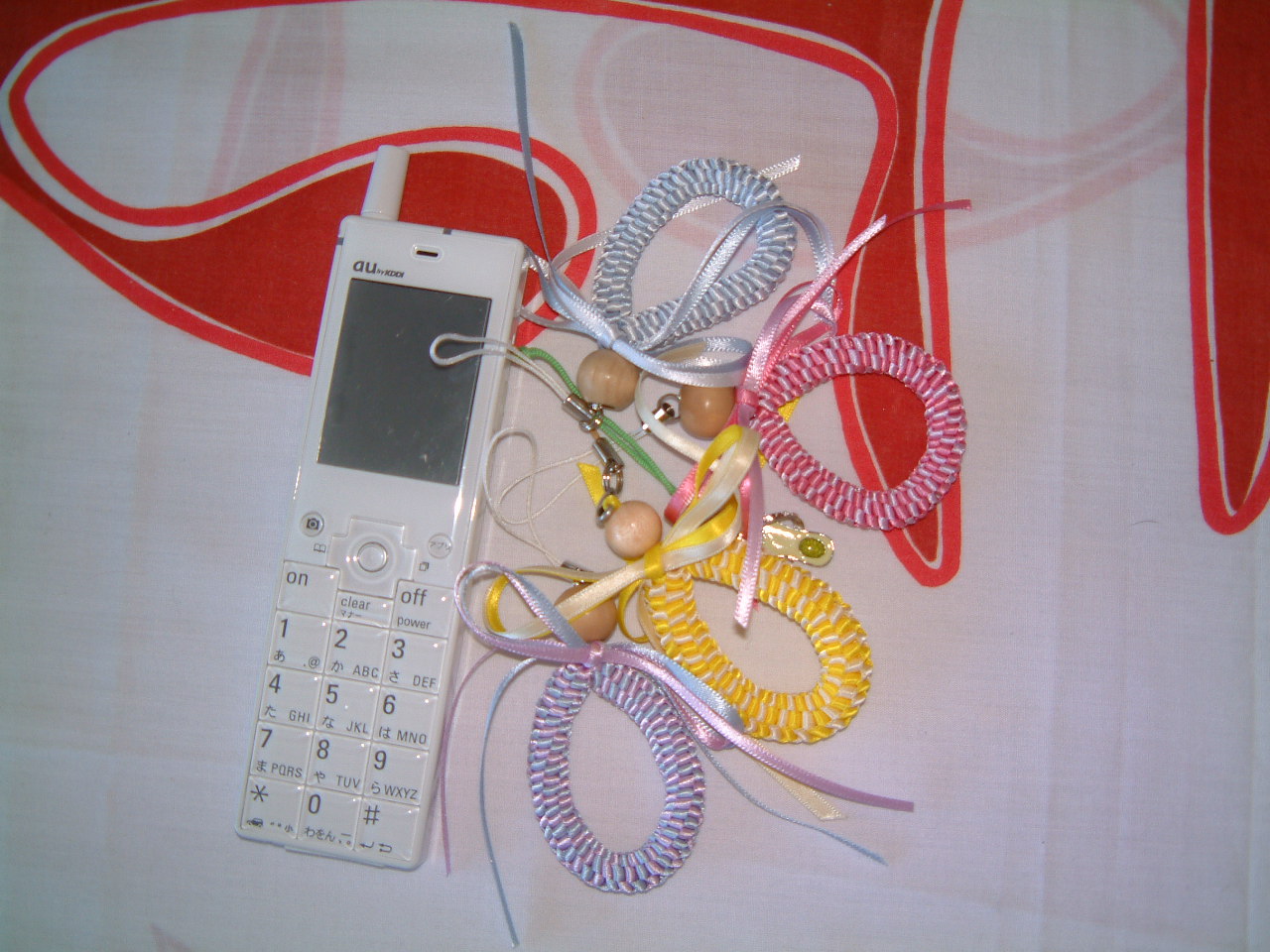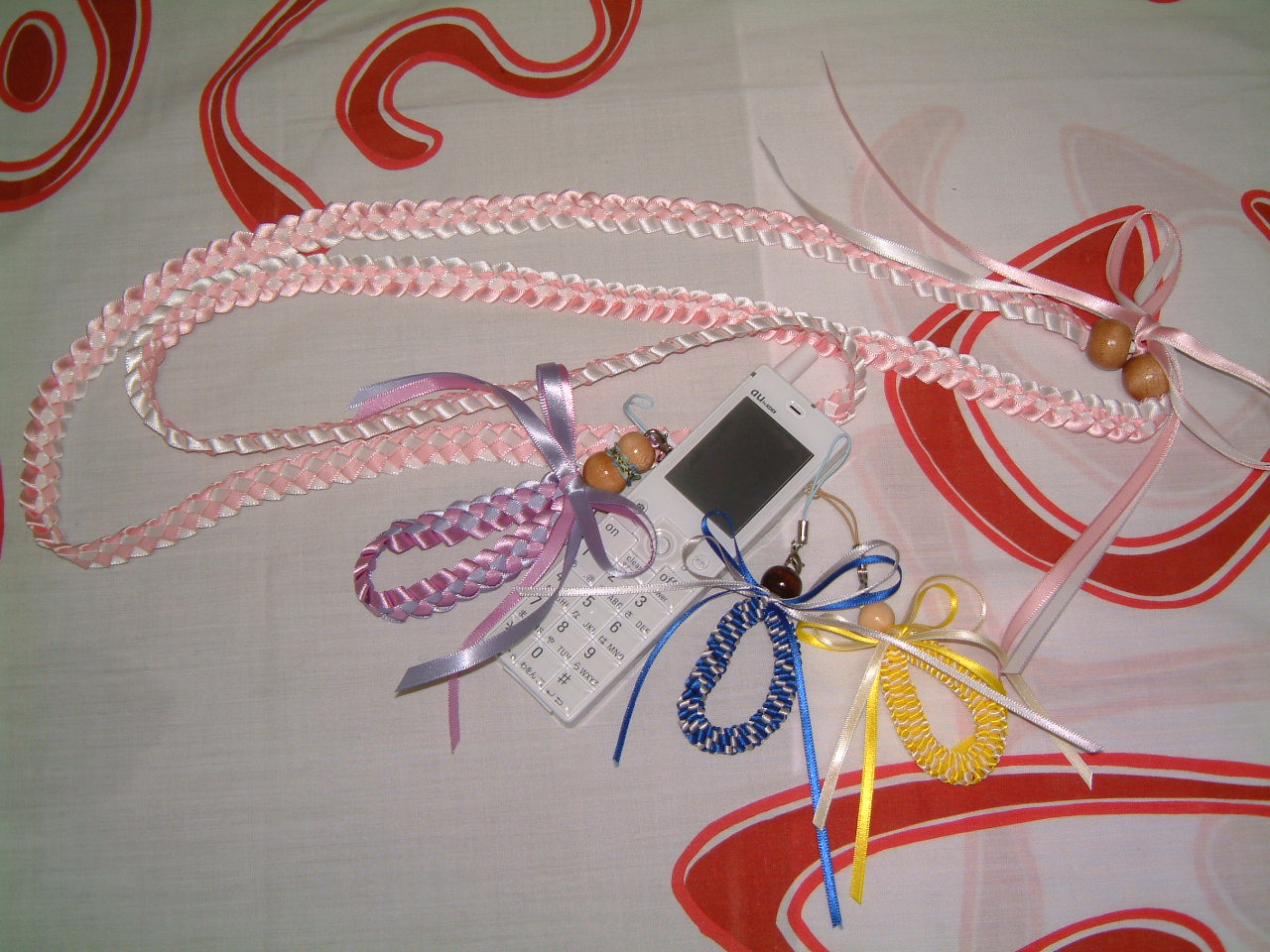 キットをお買い上げいただいたYasueさんの作品です。何と全ての種類のストラップを作ってしまいました〜。とってもスピーディーに出来上がってビックリ!スクエアーノットストラップは娘さんに取られてしまったとか! *^0^* また作ってくださいね〜♪ |