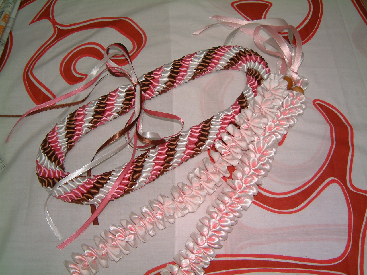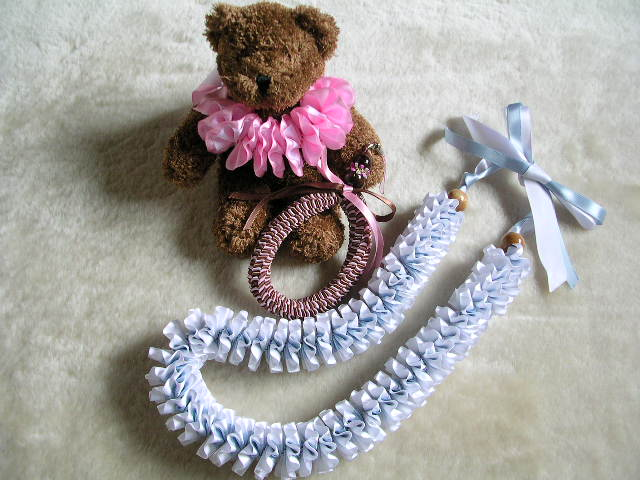 お教室に通って下さっているNozomiさんの作品です。かわいいベアーちゃんのレイもとってもキュートですね。プルメリアは花びらがとても綺麗に配置されて美しく仕上がりましたね。クマちゃんの足元にあるのはスクエアノットかな?これからもたくさんのレイを作りましょう〜♪ |