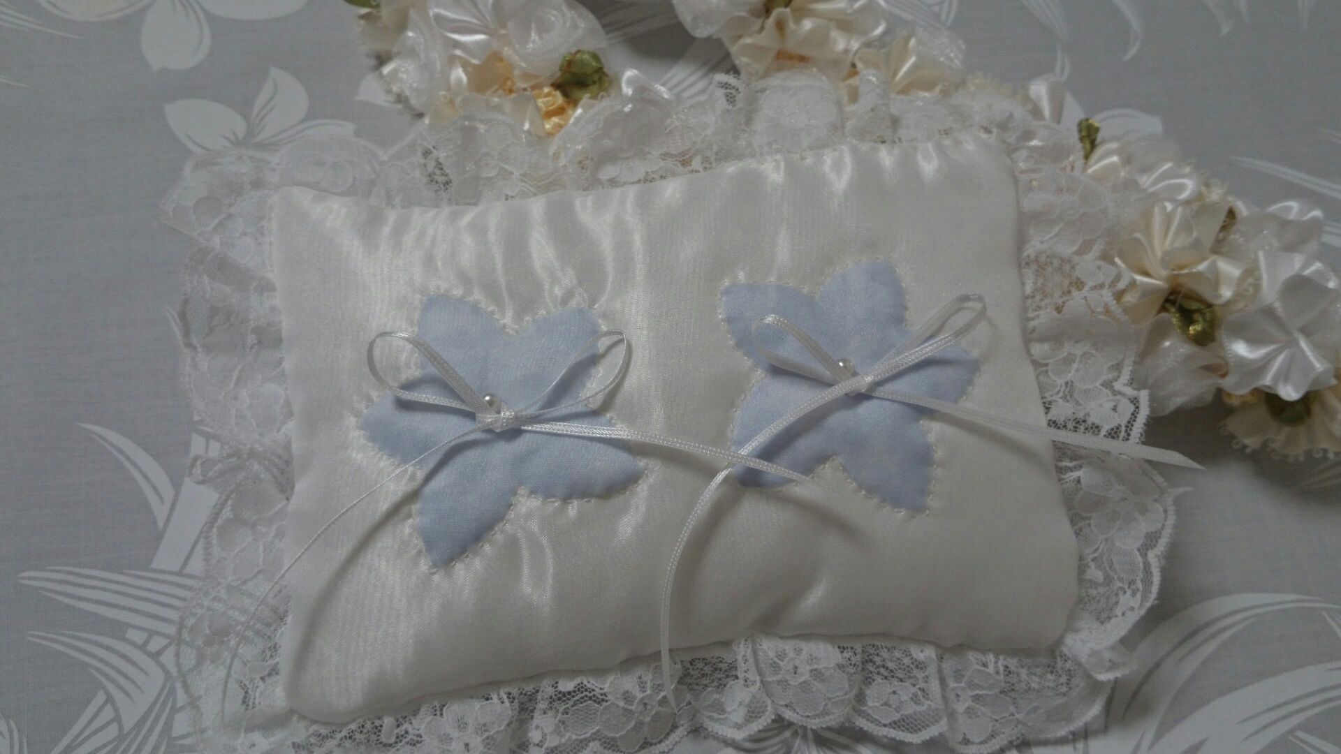 イポラニハワイイントラのMaiちゃんへプレゼント☆ハワイウエディングにふさわしいサムシングブループルメリアモチーフのリングピローとハワイアンホワイトハクレイ♪シルクサテンのベースファブリックから全て手縫いで仕上げました。
