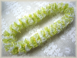 オーガンジーリボン(シアリボン)で作るやわらかくてとても軽やかなシアローズレイです。これは1ピースずつお花の形に作ってから糸に通してレイにします。 間に3mmリボンの葉っぱもポイントで入っています。パーツ作りに結構時間がかかってしまいますが、出来上がりはとってもゴージャスでかわいですよ 〜♪ お色違いはこちら