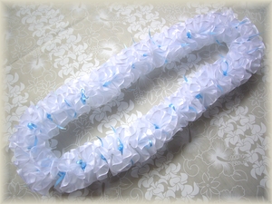 ウエディングにピッタリの「ダブルチューブローズレイ」です。サテンリボン・シフォンリボン・アセテートリボンのコラボレーションで、センスよく優雅でとてもエレガントなレイです。ぜひプレゼントに作ってみてくださいね♪