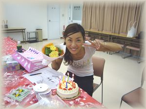 8月18日の横浜産経学園クラスは、Kumiちゃんが○○才^0^のお誕生日で皆さんでお祝いしました〜♪欠席者もいらっしゃいま したが、とても盛大にお祝いすることができました。私からはケーキ・花束・フラガールのかわいいお皿をプレゼント!とっても喜ん でくれました〜♪Mizutaniさんからは私のお誕生日も兼ねて?2人にプレゼントを持ってきてくださいました。卵の中にポプリが入っ ているとても綺麗なエッグアートの手作りプレゼントに、一同感動〜。と〜っても心のこもったプレゼントでビックリしました〜。 Big Mahalo&Kumiちゃんハッピーバースディ ^0^